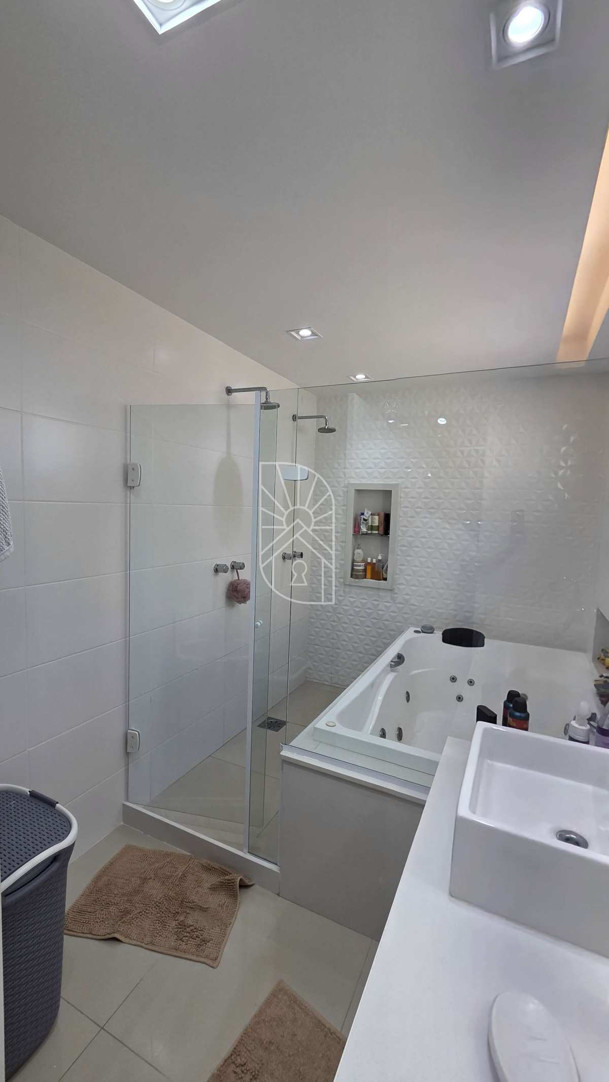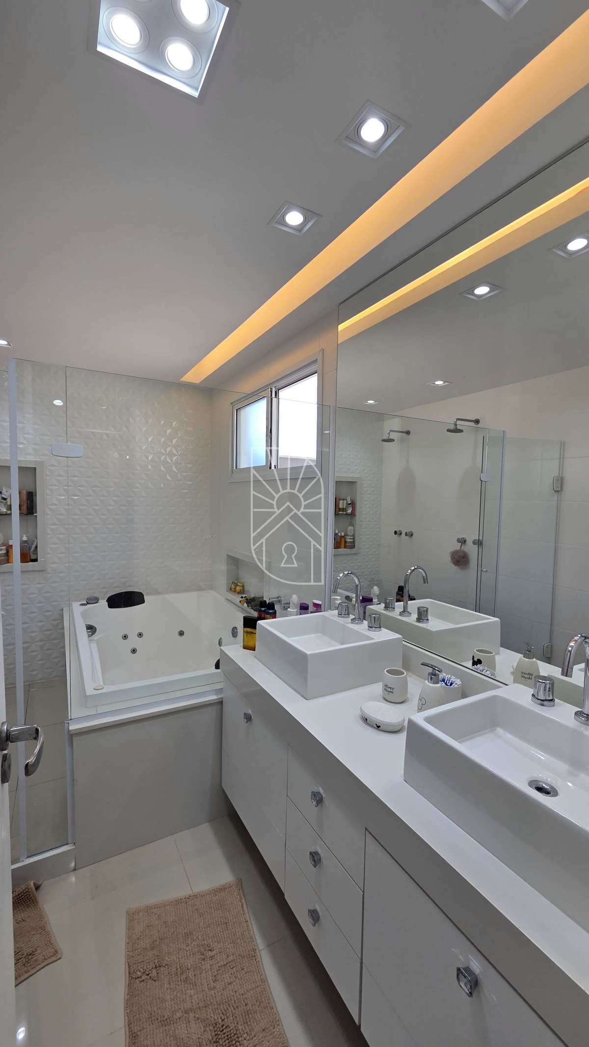 O imóvel conta com 4 suítes amplas, sendo 1 no térreo — perfeita para hóspedes ou acessibilidade. A suíte master impressiona com closet espaçoso, varandão privativo, banheiro com cuba e chuveiro duplos, além de hidromassagem para momentos de relaxamento absoluto.